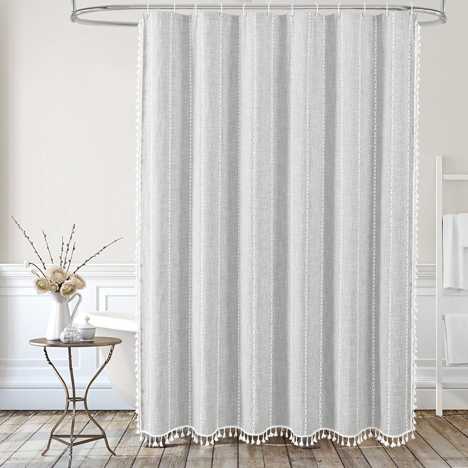- Wrinkle Free & Ultra Thick Fabric - 310 GSM, 15% linen, 85% polyester creates farmhouse like effect for this light grey shower curtain, so that it could keep in place. The quality curtain is elegant and soft, which can deliver a country-like bathroom environment.