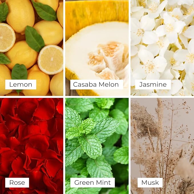 - VERBENA: Immerse yourself in the invigorating essence of Verbena, a citrusy and green aroma that captivates the senses. With sparkling lemon peel and casaba melon top notes, a heart of night-blooming jasmine, rose, muguet, and rosemary, and a white musky and green-mint base note, this fragrance embodies the perfect balance of citrus, florals, and green freshness.