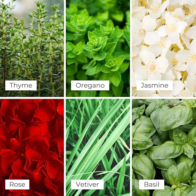 - KEY NOTES & MOOD: Sit back and enjoy this refreshing green infusion. Thyme, basil, and oregano top notes create a herbaceous and aromatic opening. Rose petals, orange flower, and jasmine heart notes infuse elegance and depth. The aromatic woods, vetiver, and balsam base notes add a grounding element. Experience a refreshing ambiance that enhances your well-being.