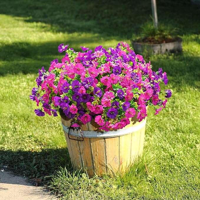 - ✅️ Abundant Set: Get 12 bundles stunning artificial outdoor morning glory flowers with green eucalyptus leaves to enhance your garden or outdoor space. Pots are not included. Artificial petunia come in a total of 2 colors, 6 purple and 6 fuchsia.