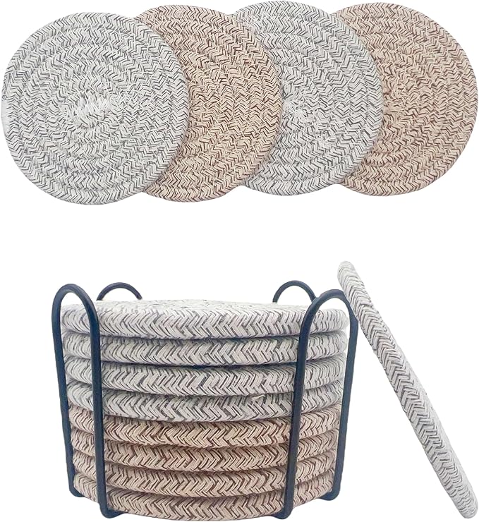 - Combination: You'll get 8pcs round hand-woven cotton coasters and 4 colors designs, with a diameter of 4.3 inches and a thickness of 0.3 inches. We also have an iron frame for storing the coasters, which can be placed in the holder when not in use, making your home cleaner.