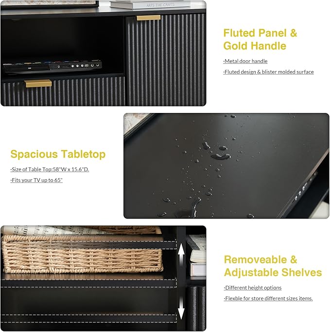 - Sleek Design & Durable Construction: Size: 58"W*15.6"D*24"H. This TV console boasts chic and contemporary designs that effortlessly blend with any interior decor style, from minimalist to eclectic. With clean lines & premium finishes, they elevate the aesthetic appeal of the entertainment center. Constructed from engineered wood and metal. Black TV stand are built to last. Sturdy construction provides a reliable foundation for your 65" television.