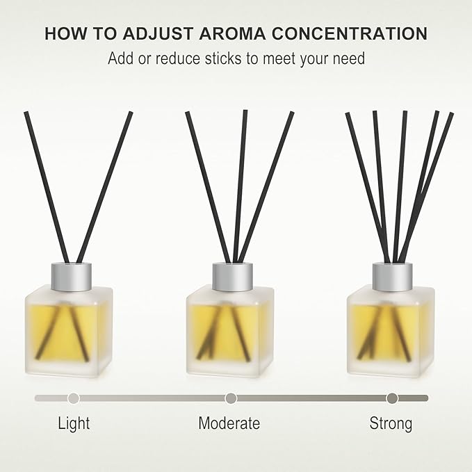 - [Adjustable Aroma Concentration] Adding or subtracting sticks appropriately can adjust the diffusion concentration. The first use of sticks can be reversed several times to quickly volatile the aroma. The effect of aromatherapy can be affected if placed for a long time. At this time, the sticks can be flipped to restore volatilization.