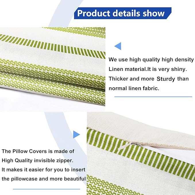 Decorative Throw Pillow Covers Set of 2 Grass Green Boho Striped Pillow Covers 18x18 Inch Throw Pillow Cover Linen Pillowcase Farmhouse Outdoor Pillow Covers for Couch Sofa Living Room