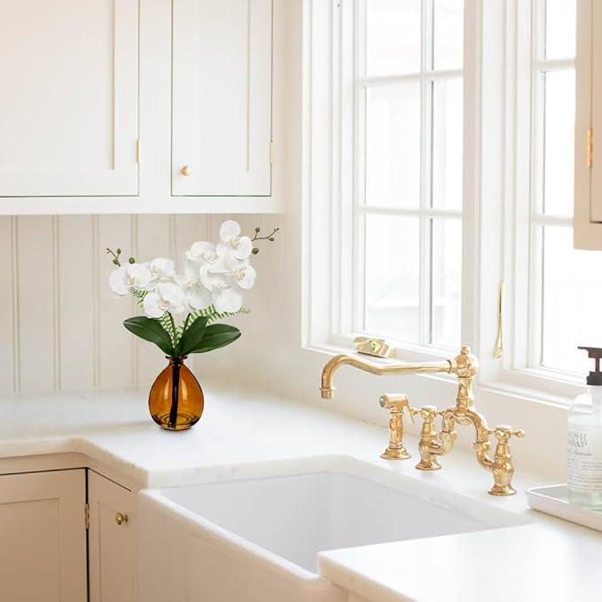 - Artificial Orchids Flowers with Vase- This artificial orchids is made of high simulation white phalaenopsis orchid with green leaves and ferns embellishment, the orchid flowers are rich in layers and lines, with eye-catching buds, are displayed in a amber glass vase perfectly, they create a harmonious and natural visual composition. The overall presentation of noble and elegant visual effect, perfectly enhance the taste of home decoration (the orchid branches cannot be takend out)