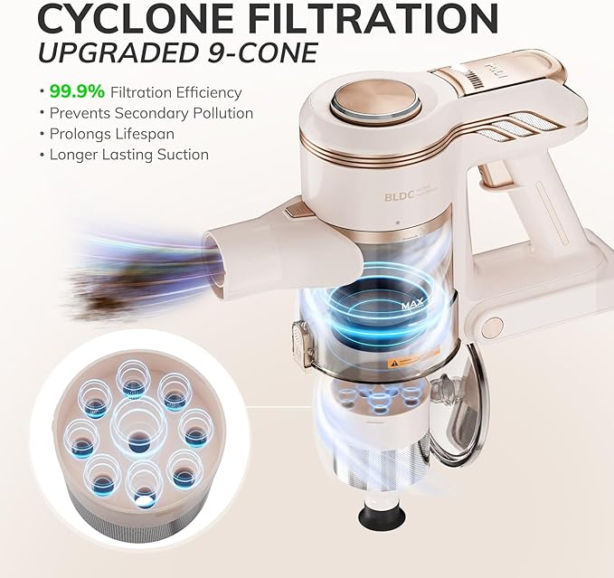 - Powerful Suction and Efficient Design. This cordless upright vacuum features an M2 strong brushless motor and a 9-cone cyclonic structure, delivering powerful suction capabilities up to 45000Pa. This efficient design ensures deep cleaning by effectively lifting dirt and debris from all surfaces. The V-shaped roller brush enhances this effect by effectively cleaning and capturing hair and pet fur without tangling.