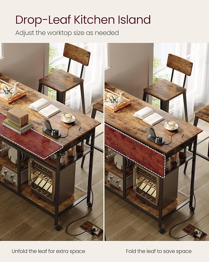 VASAGLE Kitchen Island with Drop Leaf, 47.2" Width Rolling Kitchen Cart with Power Strip, Extendable Worktop, Workbench,Pegboard, Adjustable Shelf, Rustic Brown and Ink Black UKKI013K01