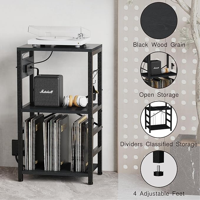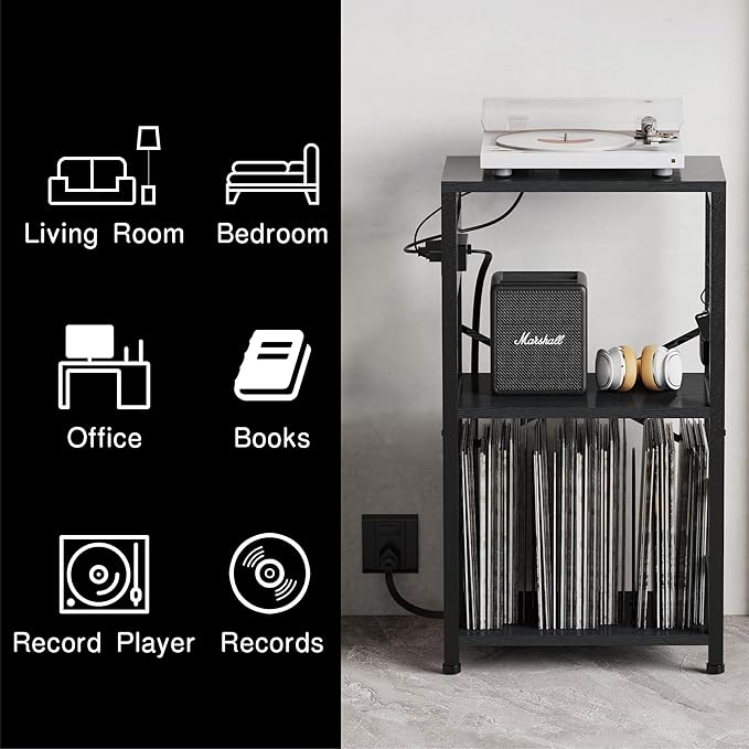 - Record Player Stand with Charging Station:This table features 3 tiers,including a spacious tabletop suitable for various record player sizes,the 2nd and 3rd(with divider bars) open storage shelves can hold all kinds of records and media essentials,providing a categorized storage solution that combines artistry and practicality.the charging station has 2 USB ports and 1 type C port,can charge all of your devices.