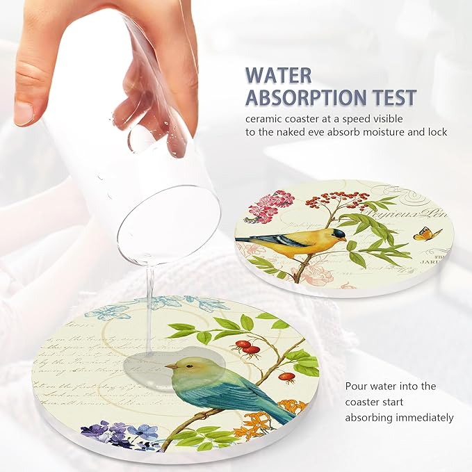 - Husiti Ceramic Coasters Set With Metal Holder: Keep Your Dining Table Stylish And Organized With This Set Of 6 4-Inch Round Coasters Featuring a Trendy Vintage Watercolor Bird Flower Pattern.