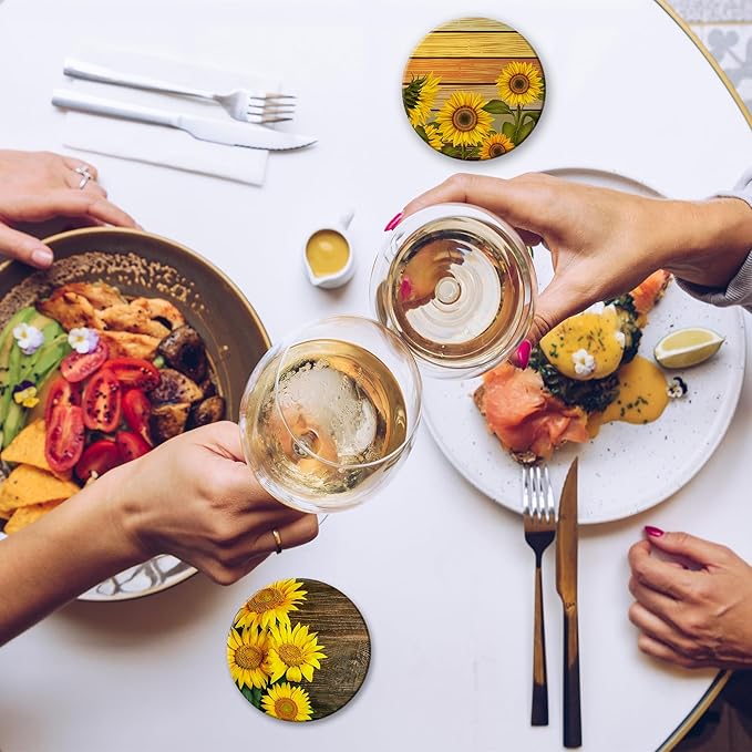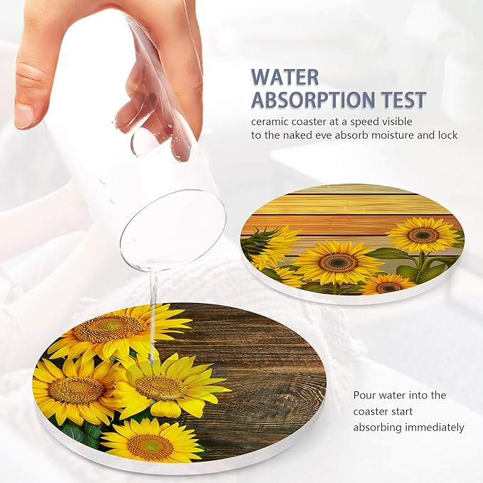 - Husiti Ceramic Coasters Set With Metal Holder: Keep Your Dining Table Stylish And Organized With This Set Of 6 4-Inch Round Coasters Featuring a Trendy Vintage Sunflower Wood Pattern.