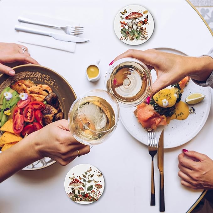 - Husiti Ceramic Coasters Set With Metal Holder: Keep Your Dining Table Stylish And Organized With This Set Of 6 4-Inch Round Coasters Featuring a Trendy Mushroom Butterfly Pattern.