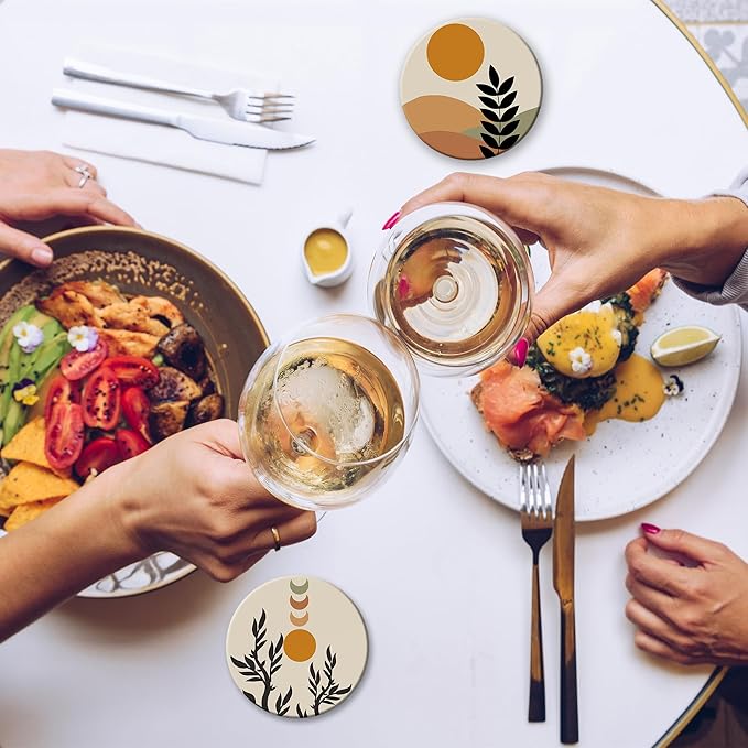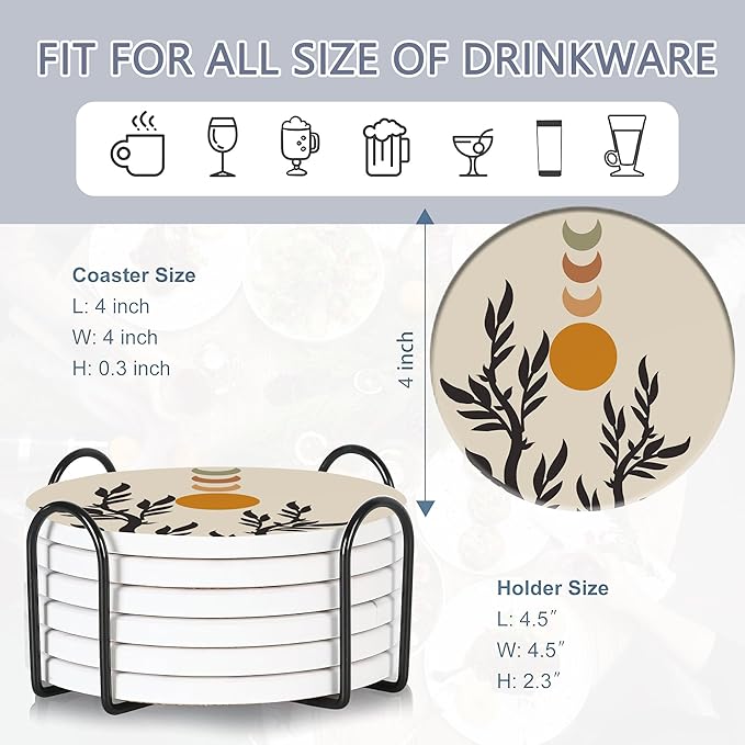 - Husiti Ceramic Coasters Set With Metal Holder: Keep Your Dining Table Stylish And Organized With This Set Of 6 4-Inch Round Coasters Featuring a Trendy Abstract Boho Sun Leaves Pattern.