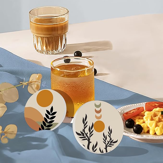 Drink Coasters Set of 6 with Holder, Abstract Boho Sun Leaves Absorbent Ceramic Coasters with Cork Base,Fit All Cups,Great Gift for Housewarming,Room Decor,Bar,Holiday Party