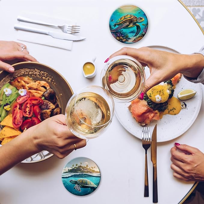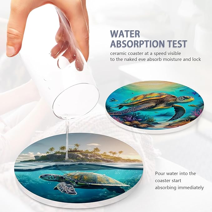 - Husiti Ceramic Coasters Set With Metal Holder: Keep Your Dining Table Stylish And Organized With This Set Of 6 4-Inch Round Coasters Featuring a Trendy Sea Turtles Pattern.
