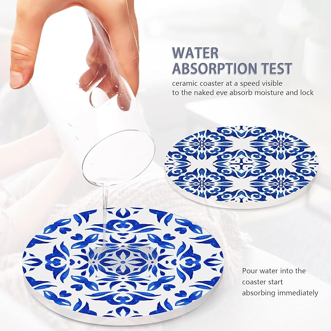 - Husiti Ceramic Coasters Set With Metal Holder: Keep Your Dining Table Stylish And Organized With This Set Of 6 4-Inch Round Coasters Featuring a Trendy Handpainted Blue Pattern Pattern.
