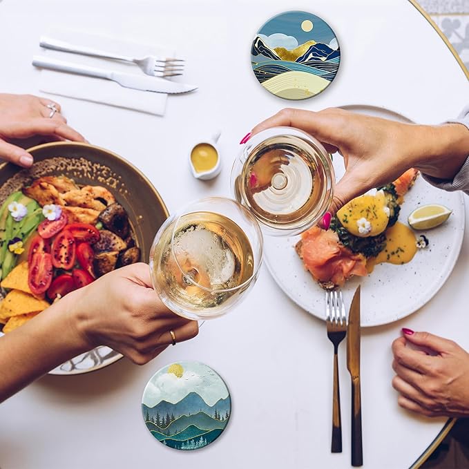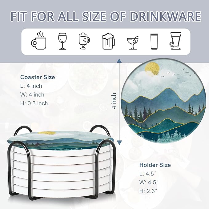 6 Pcs Coasters for Drinks with Holder, Abstract Mountain Sun Absorbent Ceramic Coasters with Cork Base,Cute Funny Table Drinks Coasters Tabletop Protection Mat,Table Home Decor,4 Inches