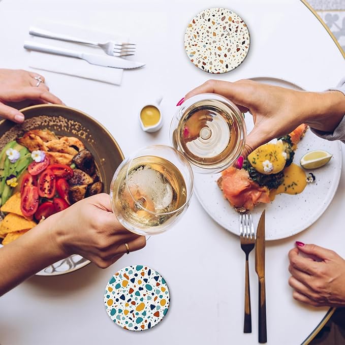 - Husiti Ceramic Coasters Set With Metal Holder: Keep Your Dining Table Stylish And Organized With This Set Of 6 4-Inch Round Coasters Featuring a Trendy Terrazzo Marble Pattern.