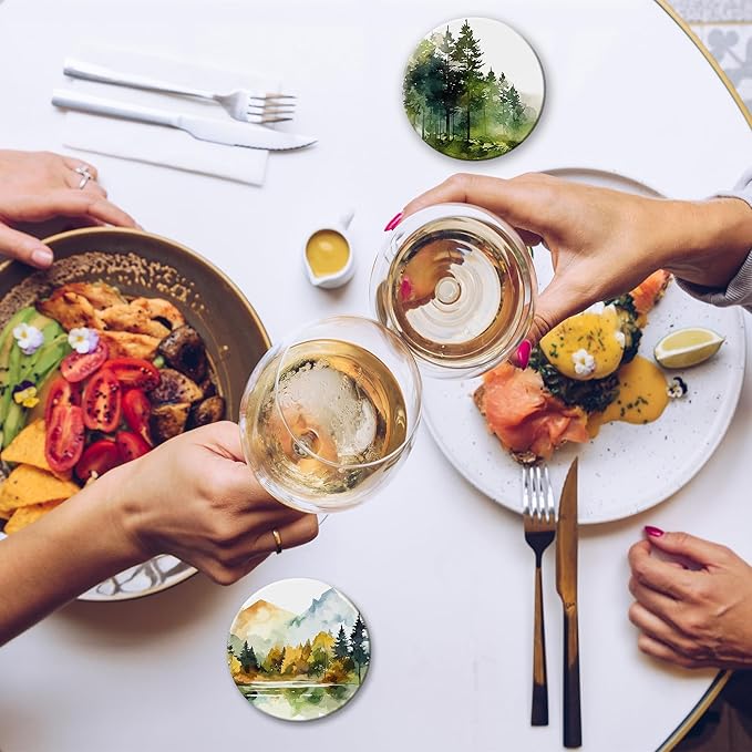 - Husiti Ceramic Coasters Set With Metal Holder: Keep Your Dining Table Stylish And Organized With This Set Of 6 4-Inch Round Coasters Featuring a Trendy Watercolor Misty Forest Pattern.