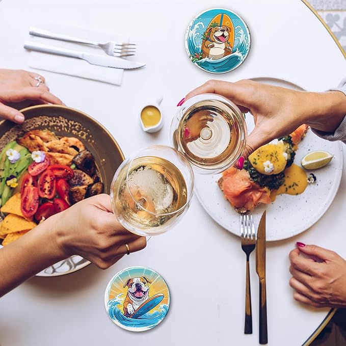 - Husiti Ceramic Coasters Set With Metal Holder: Keep Your Dining Table Stylish And Organized With This Set Of 6 4-Inch Round Coasters Featuring a Trendy Cute Dog Surfing Pattern.