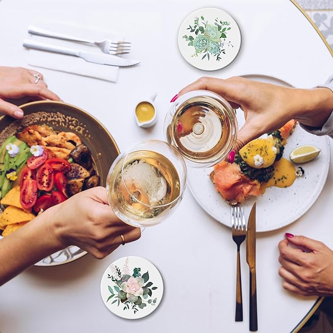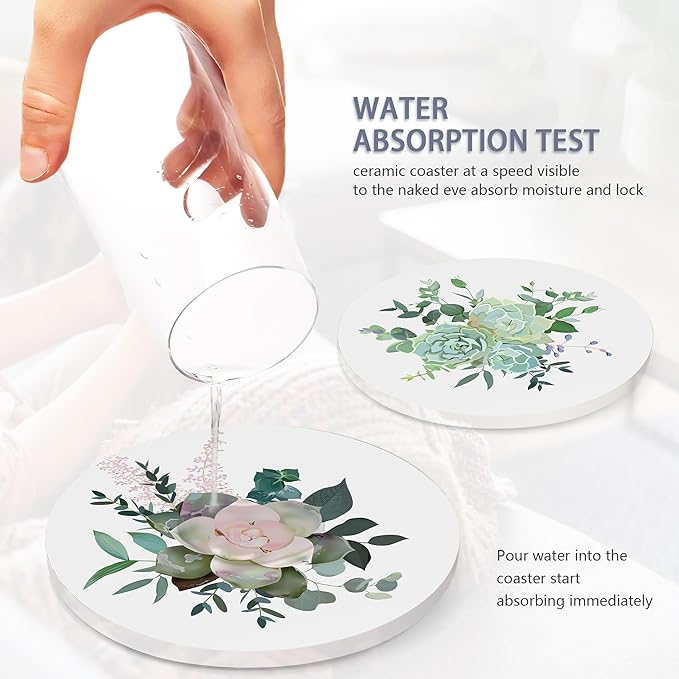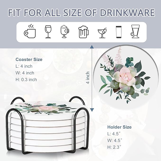 - Husiti Ceramic Coasters Set With Metal Holder: Keep Your Dining Table Stylish And Organized With This Set Of 6 4-Inch Round Coasters Featuring a Trendy Cactus Succulent Flower Pattern.