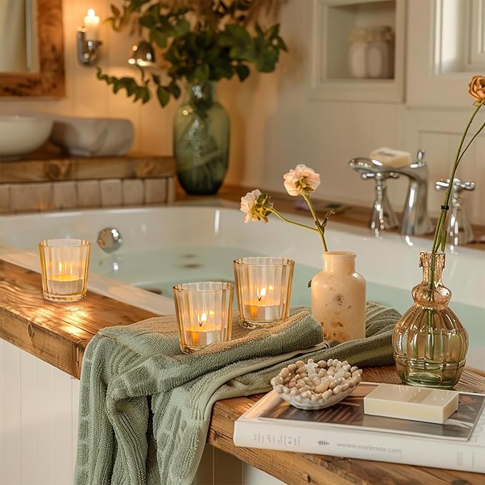 - Elegant Design: The glass candle holder features an ribbed design that elevates the decor of any home; When a votive candle is lit inside, the light shines through the ribbed pattern, casting a romantic glow that adds warmth and comfort to any living space