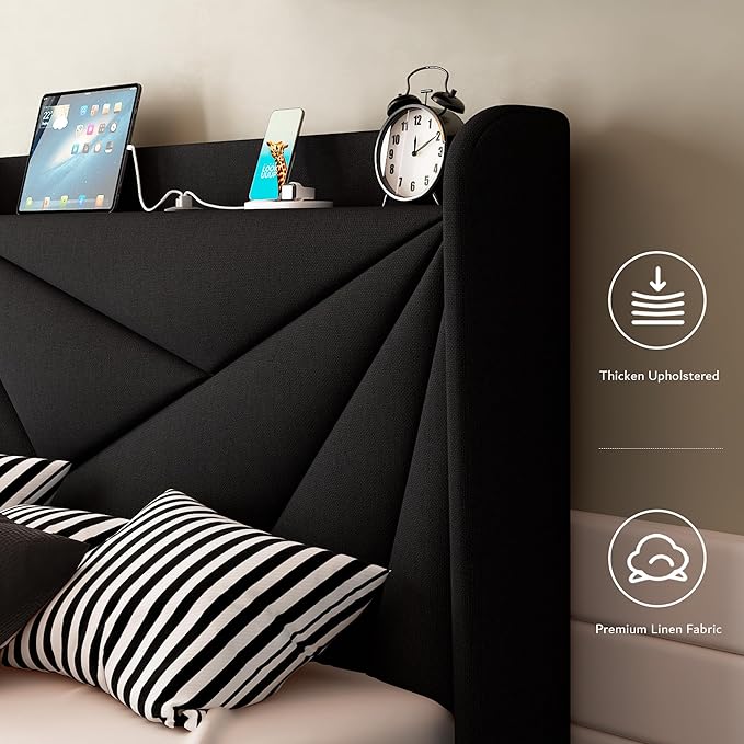 iPormis Twin Size Bed Frame with Charging Station, Linen Platform Bed Frame with Wingback Headboard Upholstered Bedframe, Solid Wood Slats Support, No Box Spring Needed, Easy Assembly, Black