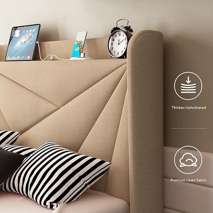 iPormis Twin Size Bed Frame with Charging Station, Linen Platform Bed Frame with Wingback Headboard Upholstered Bedframe, Solid Wood Slats Support, No Box Spring Needed, Easy Assembly, Beige