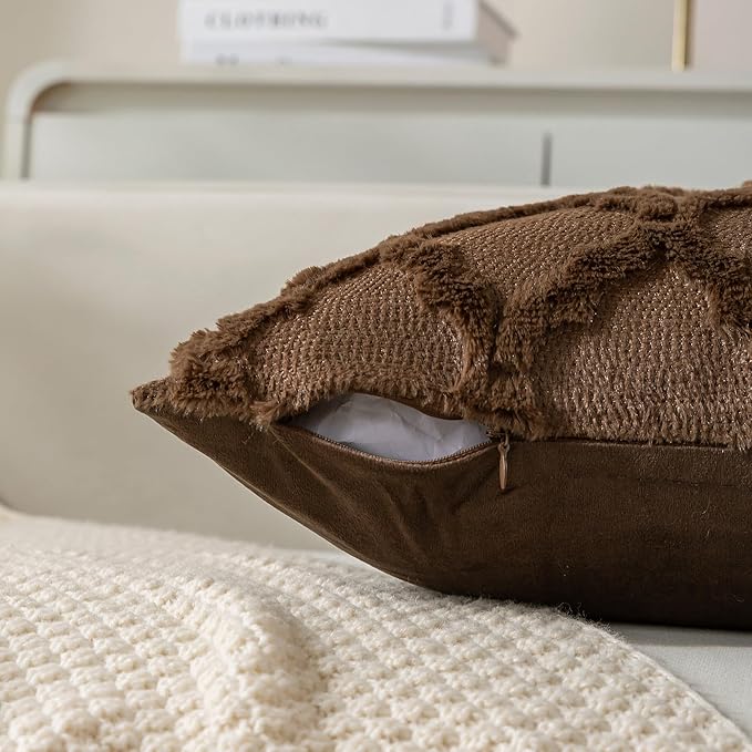 Set of 2 Soft Moroccan Throw Pillow Covers 12x20 Inch Plush Boho Decorative Pillow Cover Accent Cushion Case for Couch Sofa Bed, Deep Brown