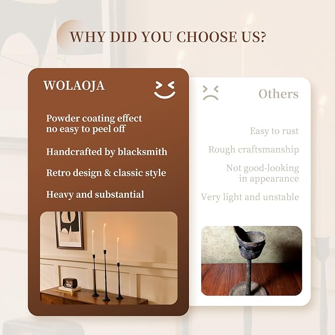 - TAPER CANDLE HOLDER -Retro with modern,traditionary style , different height candlesticks, the visual effect of the high and low undulating candlelight gives you a wonderful feeling.The candle holders cup is designed as a red wine glass, heavy round base, the black candlestick holders firm and stable. Made of high-quality metal materials, anti rust and anti-corrosion, shiny luster .