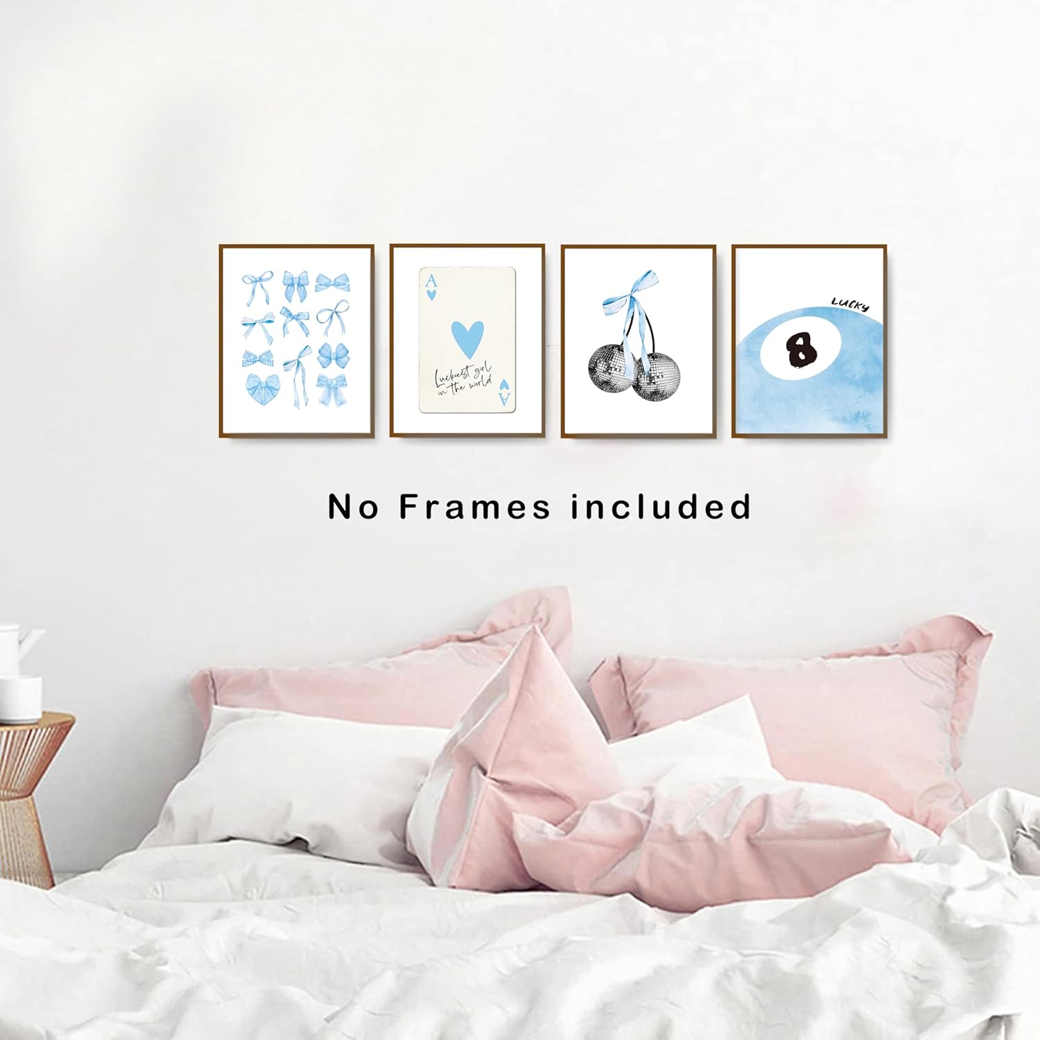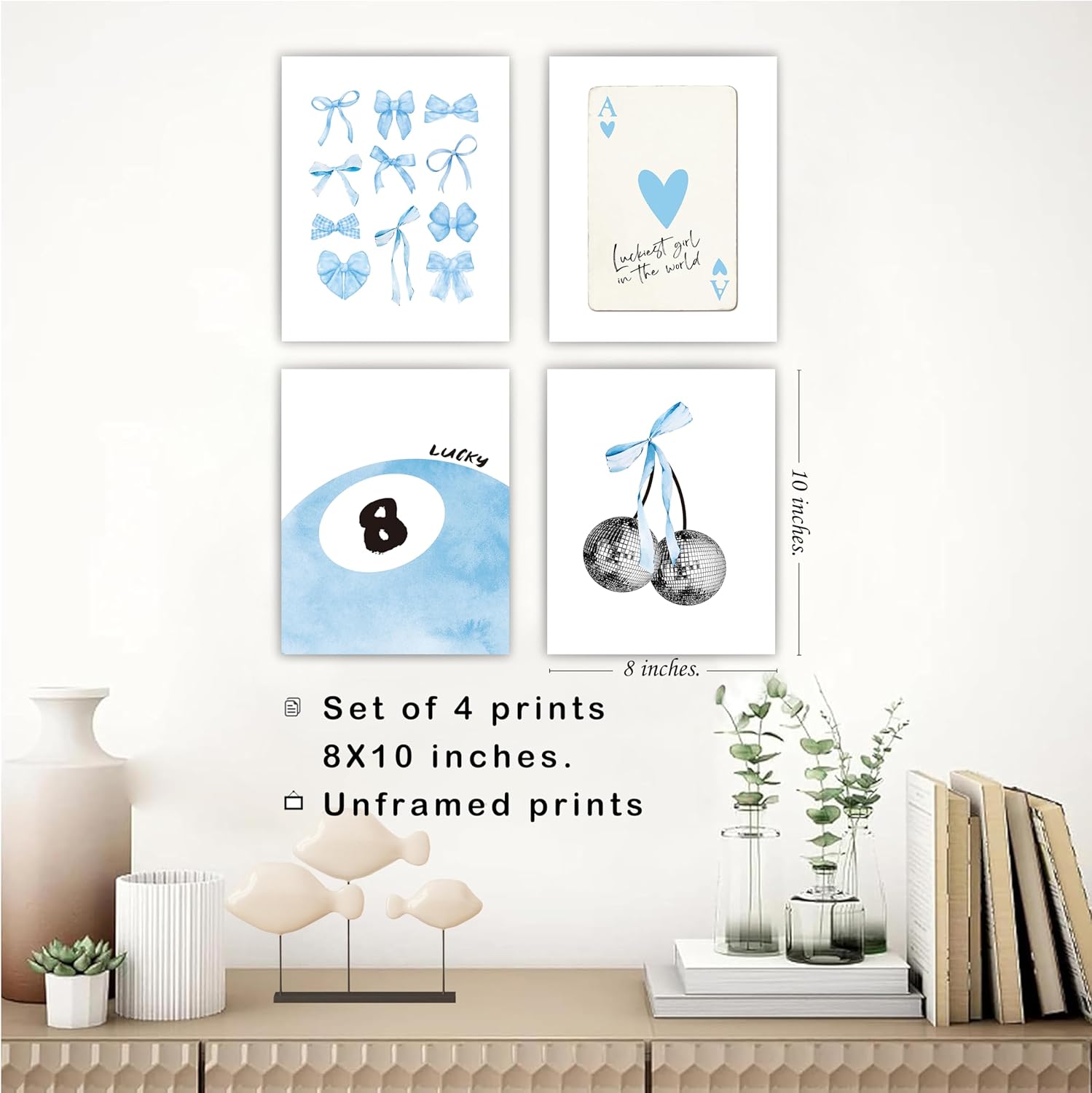 okaxscm Blue Coquette Trendy Preppy Wall Art Prints Set of 4, Coquette Room Decor, Preppy Room Decor Aesthetic, Blue Bow Disco 8 Ball Cherry Wall Decor Posters for Girls Bedroom Dorm, 8x10 Unframed
