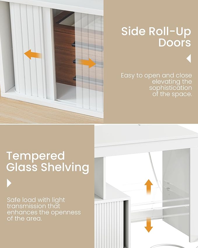 - Versatile Storage: The media console includes a wide top and a concealed cabinet with roller shutter doors, plus 2 glass shelves with 3 height adjustments for flexibility and light transmission, easily housing DVDs, gaming consoles, routers, etc.