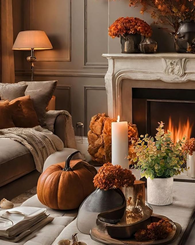 - 【Natural Look】 The eucalyptus fake fall plants are made of plastic,comes with gray paper pulp pots.No daily care needed, the eucalyptus fall decor is easy to maintain, always remain green and fresh.It's very classic looking,suitable for those who like plants but have no time to take care.esh.Suitable for those who like plants but have no time to take care.