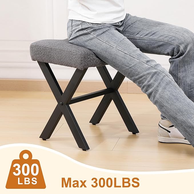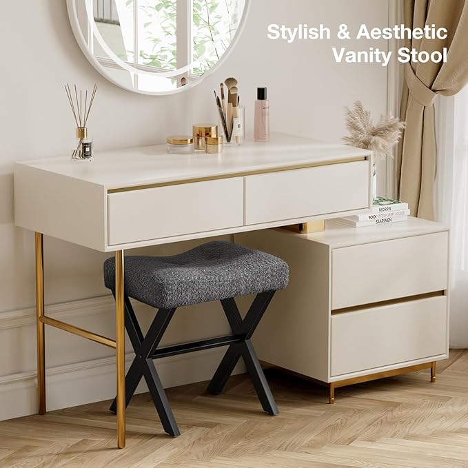 18-Inch Vanity Stool Chair, Vanity Bench with Metal X-Legs, Ottoman Accent Stool with Breathable and Soft Boucle Fabric Saddle Seat, Grey