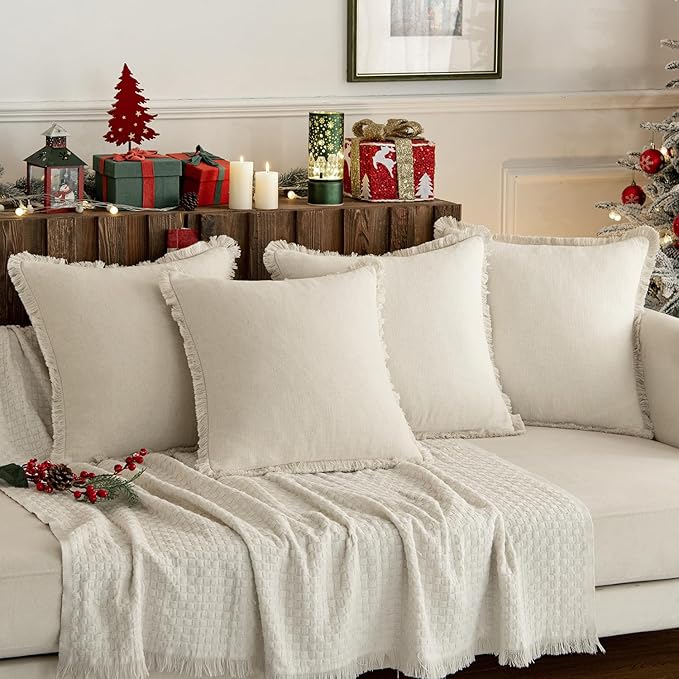 MIULEE Linen Pillow Covers 18x18 Inch Natural Beige Decorative Throw Pillows with Fringe Pack of 4 Soft Farmhouse Boho Couch Pillows Home Decors for Sofa Cushion Living Room Bed