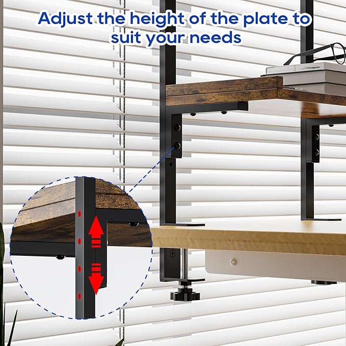 - 【Great Decoration at Home/office】 -- Our desk shelf can be used upside down, it can be mounted not only above the table as usual, but also below it, maximizing its functionality to meet your needs. Two-layer shelf offers spacious storage space for office supplies, books, gaming devices,etc.
