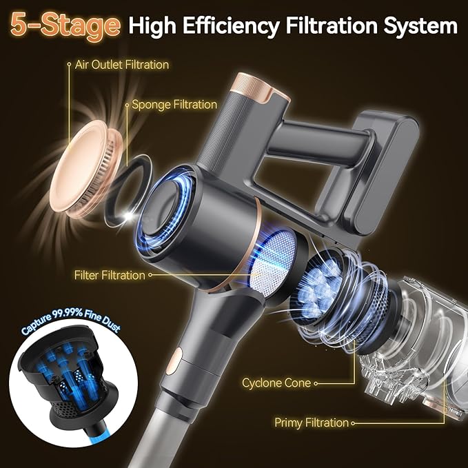 - Upgraded 5-Stage Filtration System- This cordless stick vacuum cleaner features an upgraded 5-stage complete sealed filtration system to lock small particles without leakage, especially adopting 8-hole multi-cone cyclone separation technology to capture and separate dust particles as small as 0.01 micrometers to avoid secondary pollution, bringing your family comfortable living environment. You will get an extra filter for backup