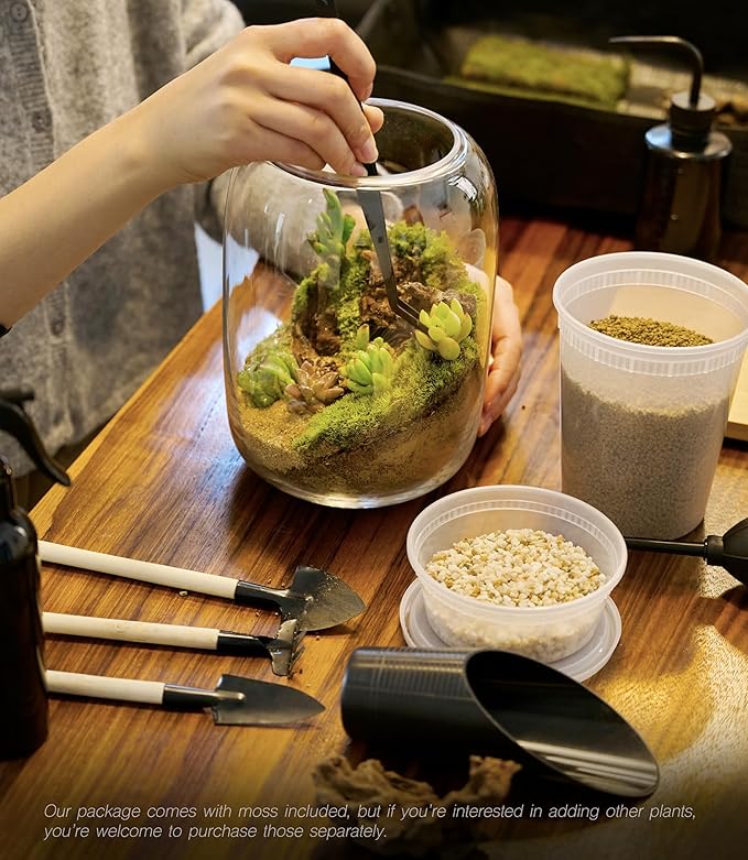 - Included Components : terrarium jar, potting soil, garden gravel, clear sand, live moss, plant mat, 2 shovels, rake, spray bottle, scoop, stainless steel tweezers, brush, 4 pieces of driftwood, 6 landscape stones, 2 decorative ornaments, grow light terrarium jar, potting soil, garden gravel, clear sand, live moss, plant mat, 2 shovels, rake, spray bottle, scoop, stainless steel tweezers,… See more