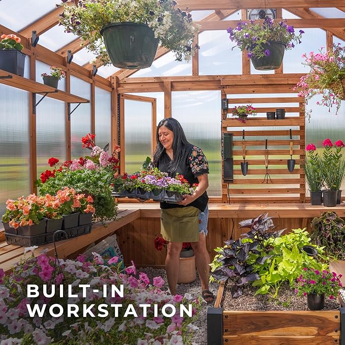 - Spacious Interior: 143 square feet of interior space with a built-in workstation offers 33 linear feet of lower staging shelves, 15 feet of upper shelves, and 8 plant hooks, providing ample room for wheelbarrows, large plants, and raised planters