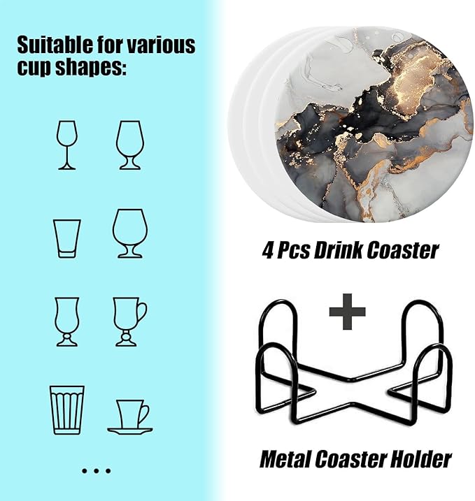 - Coaster set with holder:The set includes 4 ceramic coasters and a black metal stand, the coasters measure 4 inch in diameter and 0.27inch thick, these marble watercolor style coasters fit all types of mugs and look great with these mugs!