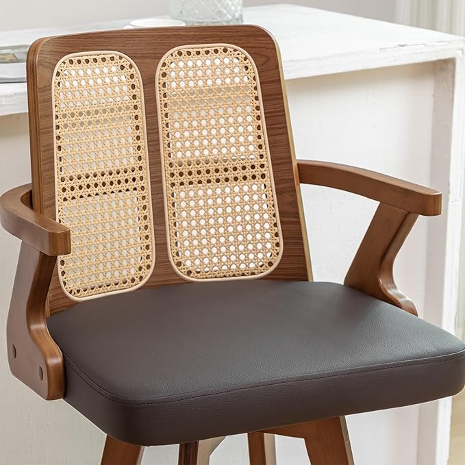 Set of 1 Swivel Counter Height Bar Stool - 27 inch Walnut Counter Stool with Cane Back, Upholstered Seat, Curved Arms, Faux Leather Bar Stool for Counter/Kitchen/Island/ (Walnut Brown)