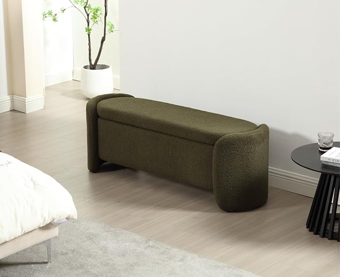 Modern Green Storage Ottoman Bench - Upholstered Boucle Teddy Fabric 50" End of Bed With Sherpa Seating for Bedroom/Entryway/Living Room/Window