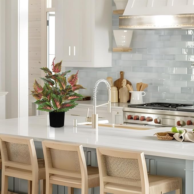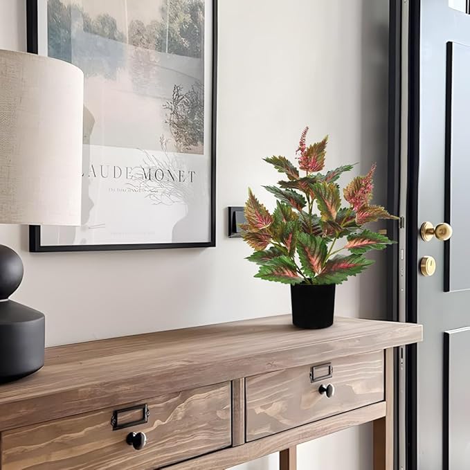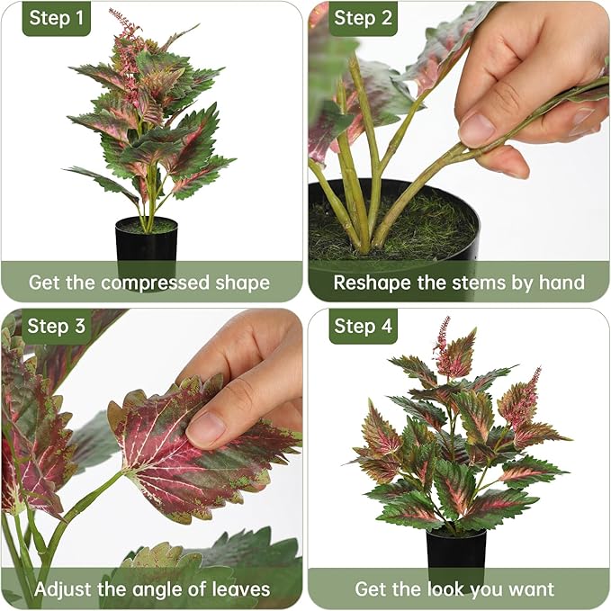 - Artificial Plants Indoor - Our lifelike perilla plant features silk leaves showcasing a vibrant green-to-rose-red gradient, enhanced by precise veining and naturalistic serrated edges. Each leaf mimics fresh growth with delicate color variations and glossy finishes, while 23 densely arranged foliage layers create a lush, organic silhouette. The subtle inclusion of slender flower stems adds botanical depth, perfect for adding lively elegance to any space, offering a touch of nature without upkeep