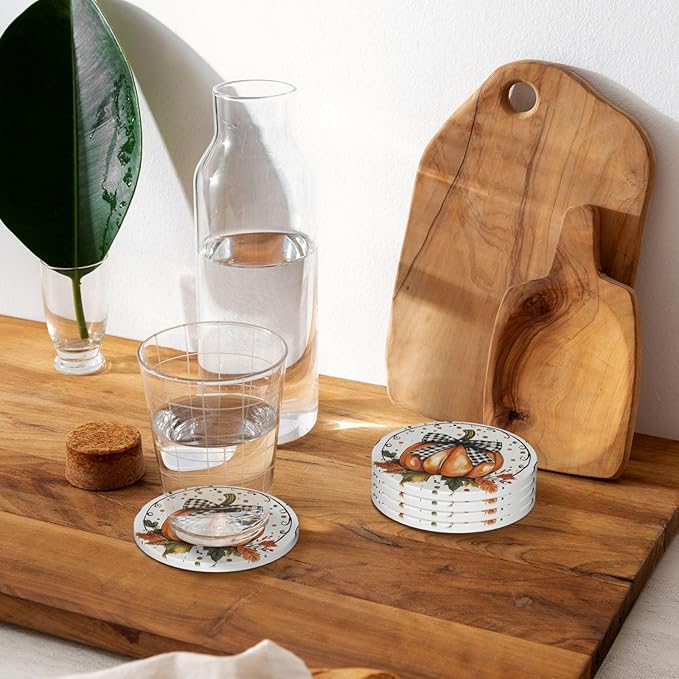 Autumn Bow Pumpkin Coasters for Drinks Fall Maple Leaves Absorbent Ceramic Coaster Set of 4 for Coffee Table Cup Bar Coasters with Cork Base Round Stone Mats Holiday New Home Decors