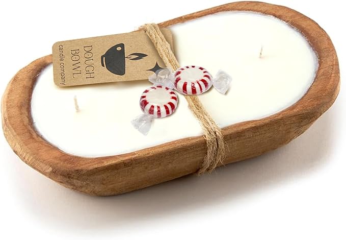 Dough Bowl Candle Co. Peppermint Soy Candle - 3 Wick Rustic Farmhouse Decor Odor Eliminator in Wooden Bowl, 20 Ounce, All-Natural Gift for Women and Men, Coffee Table Decor