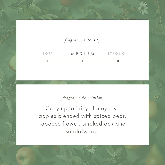 - THE FRAGRANCE: Embrace the crisp freshness of Honeycrisp apples and spiced pear, layered with the warmth of tobacco flower, smoked oak, and sandalwood, evoking a sunlit stroll through an orchard in late August.
