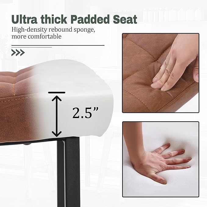 - Water Resistant Faux Leather Padded Seat - The water resistant faux leather seat is also stain resistant and scratch resistant, which is easy to clean and maintance. These exquisite faux leather barstools lend the luxe feel you’ve been craving for your kitchen's countertop, island, or in your dining space. You and your guests will love the contoured seat, high-density, padded sponge cushion, and supple faux leather upholstery