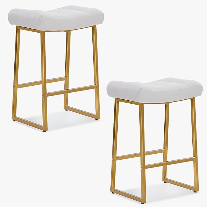 White & Gold Counter Height Bar Stools Set of 2 for Kitchen Counter Modern Backless Barstools with Upholstered Faux Leather Seat and Metal Frame Industrial 24 inch Bar Chairs
