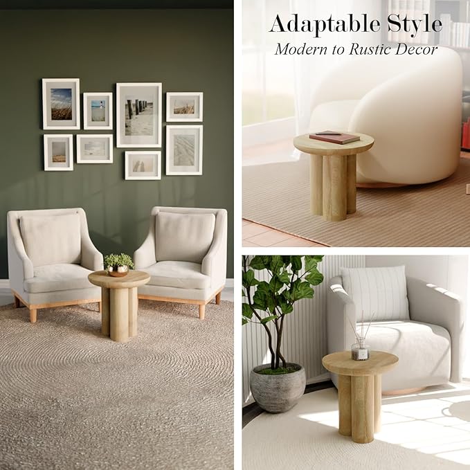 - [RUSTIC ELEGANCE IN SOLID WOOD]: This Gaia Round End Table, crafted from premium mango wood, offers a rustic yet refined look, making it ideal for end tables in the living room. With its natural finish, it elevates your modern home décor, creating a warm, inviting space perfect for relaxing.