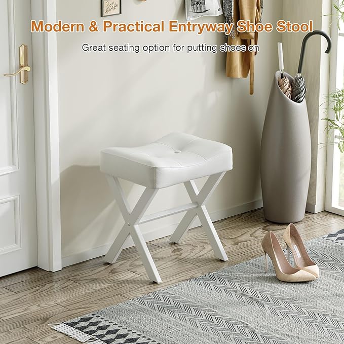 18-Inch Leather Vanity Stool Chair, Vanity Bench with Metal X-Leg, Ottoman Accent Stool with Thick Padded Saddle Seat, White
