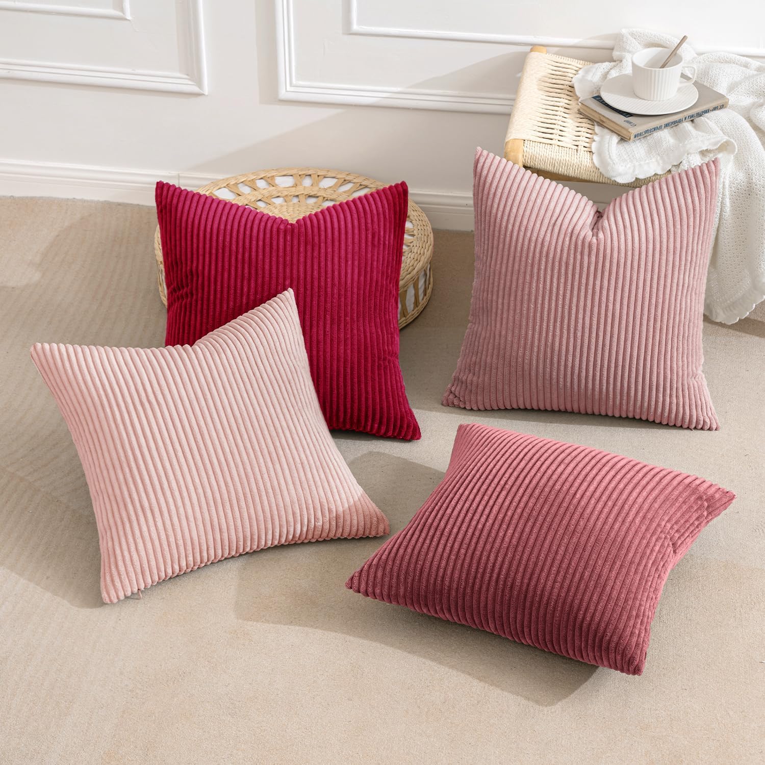 MIULEE Boho Farmhouse Christmas Throw Pillow Covers 18x18 Inch Set of 4 Romantic Decorative Cushion Covers Spring Corduroy Home Decor for Feminine Valentines Couch Bed Sofa Living Room Aesthetic Pink